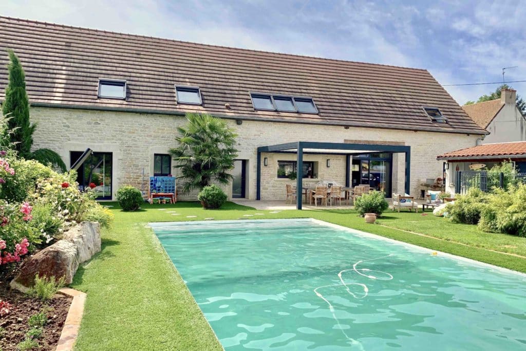 La bâtisse repose sur un terrain clos et paysagé de 1600 m2. On trouve alors un vaste garage de 80 m2, une superbe cour pavée, une piscine ,un pool house, et une pergola bioclimatique permettant de profiter d’un extérieur bucolique.