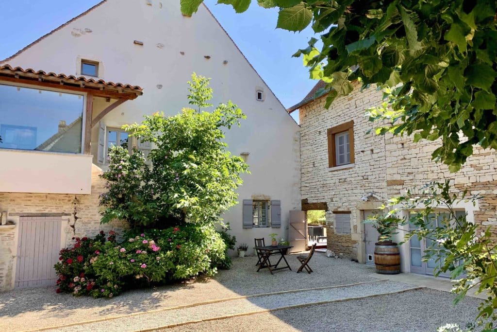 Nous traversons une belle cours gravillonnées pour découvrir une grange de 120 m2 habitables, avec un vaste espace à vivre, 3 chambres, 3 salle de bains, et un espace jacuzzi.