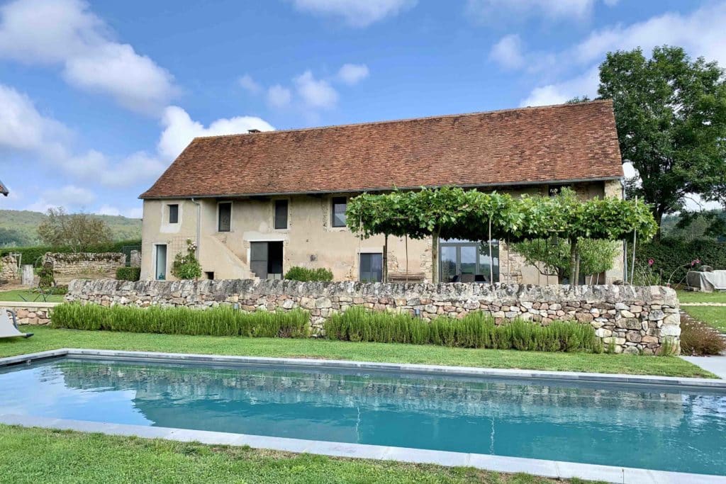 La ferme, rénovée par un architecte avec un subtil mélange de pierre et de béton brut, propose 225 m2 répartis en 2 habitations. La première, propose une cuisine ouverte sur salon, une buanderie, 2 chambres et une salle de bains. La seconde, comprend un salon, une cuisine ouverte sur séjour, une chambre avec salle d’eau privative, un salon TV, 2 chambres avec cabinet de toilette, et un espace douche.