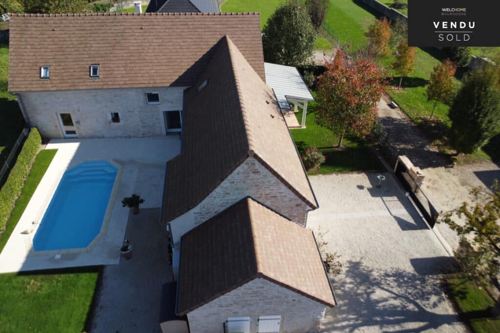 La maison repose sur un terrain de 780 m2 agrémenté d’une piscine et d’un atelier aménagé dans l’ancien poulailler.