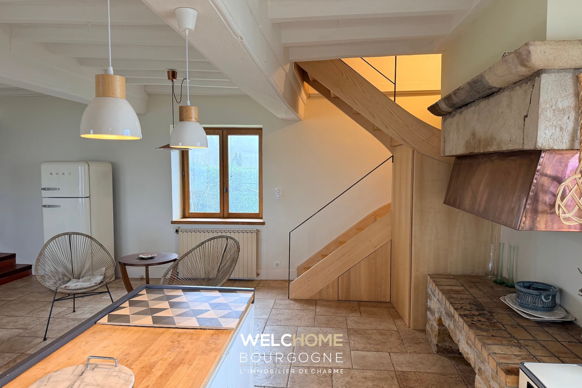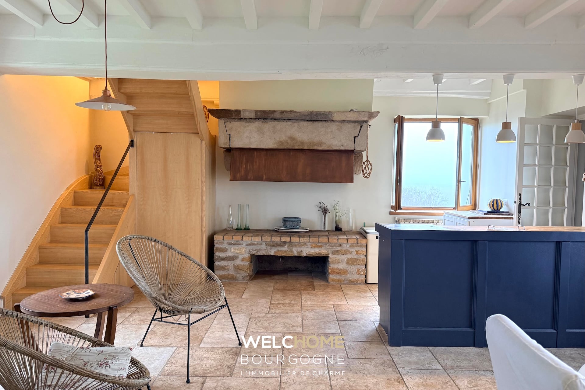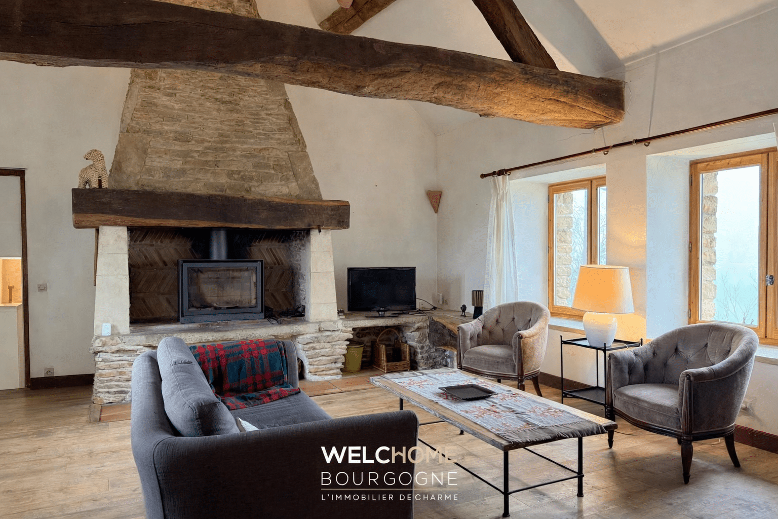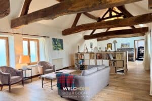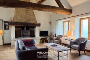 – Un vaste salon avec cheminée, chaleureux et structuré par de belles poutres apparentes