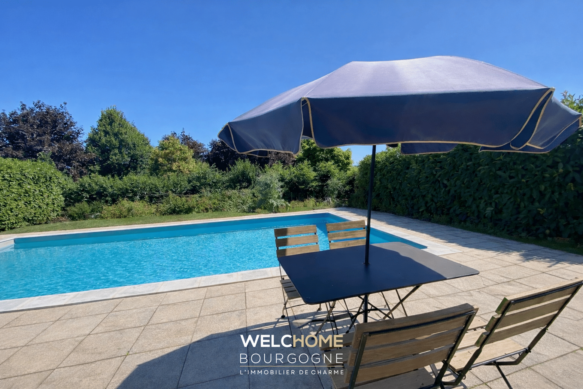 Une grande piscine de 10 x 5 mètres prolonge les beaux jours, accompagnée d’une petite cuisine d’été.