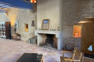 L’hôtel particulier principal développe environ 250 m² habitables. Le rez-de-chaussée s’ouvre sur une entrée avec espace cuisine et bloc sanitaire, puis une impressionnante pièce de vie de 67 m², véritable cœur de la maison, avec accès direct aux caves et à l’étage par un escalier à vis en pierre.