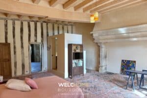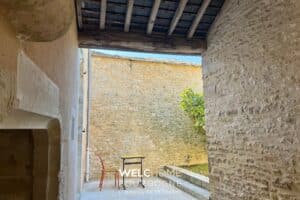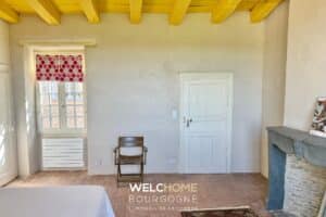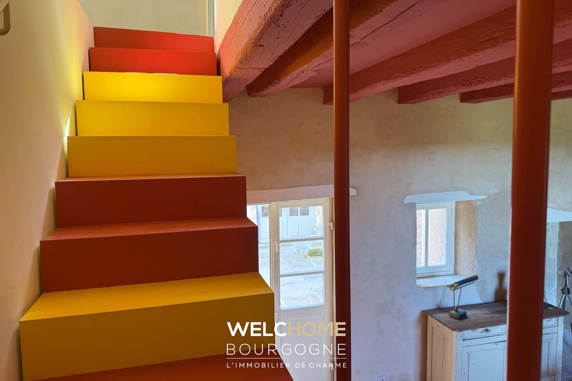 Depuis l’hôtel particulier, on accède à une cour carrée intime, puis à une maison d’amis d’environ 70 m², accessible aussi par une galerie bourguignonne reliant les deux bâtisses au premier étage. Cette dépendance, rénovée avec une touche contemporaine, marie élégamment charme ancien (tomettes, plafonds à la française, fours à pain) et couleurs vives. Elle se compose d’un salon au rez-de-chaussée et, à l’étage, d’une chambre avec salle d’eau et toilettes. Un espace parfait pour accueillir famille et amis.