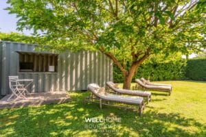 Le potager, les essences variées, la piscine et les zones ombragées composent un véritable décor de vacances au quotidien. Un container aménagé en bar d’été vient parfaire l’ensemble, apportant une touche conviviale et inattendue, dans un esprit guinguette.
