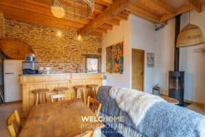 À l’extrémité de la longère, en rez-de-chaussée, un petit appartement indépendant complète l’ensemble : un séjour avec cuisine et une salle d’eau avec WC, idéal pour recevoir, louer, ou offrir une autonomie totale à un adolescent ou à des amis de passage.