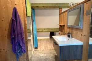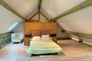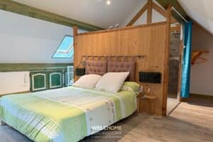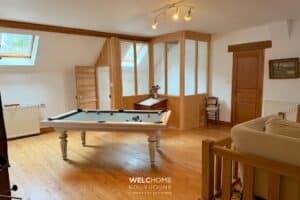 L’étage dispose d’un salon/salle de jeu, et de 2 chambres avec leur salle d’eau et wc.