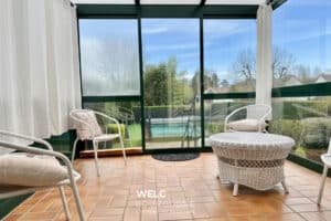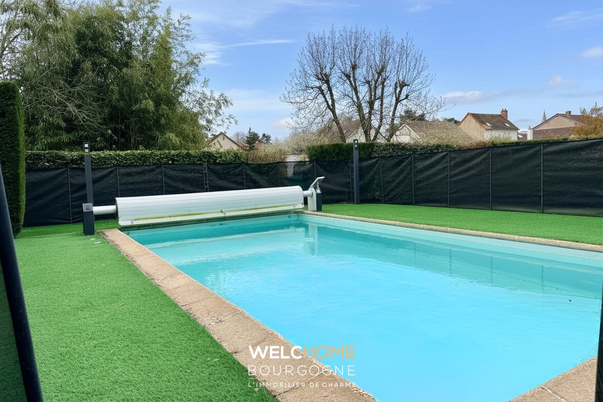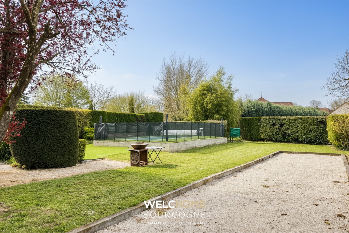 Édifiée sur un joli jardin clos de 830 m², la propriété offre un cadre de vie particulièrement agréable, agrémenté d’une piscine 8 x 4 m sécurisée par volet roulant et d’un terrain de pétanque.