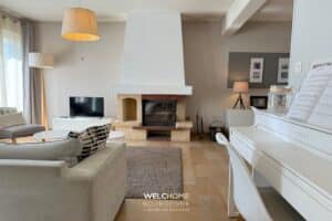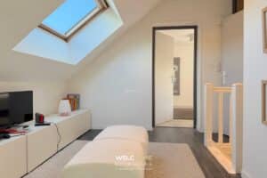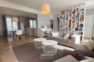 Les aménagements intérieurs, incluant des bibliothèques et meubles bas dessinés sur mesure, confèrent à l’ensemble une atmosphère harmonieuse et actuelle.