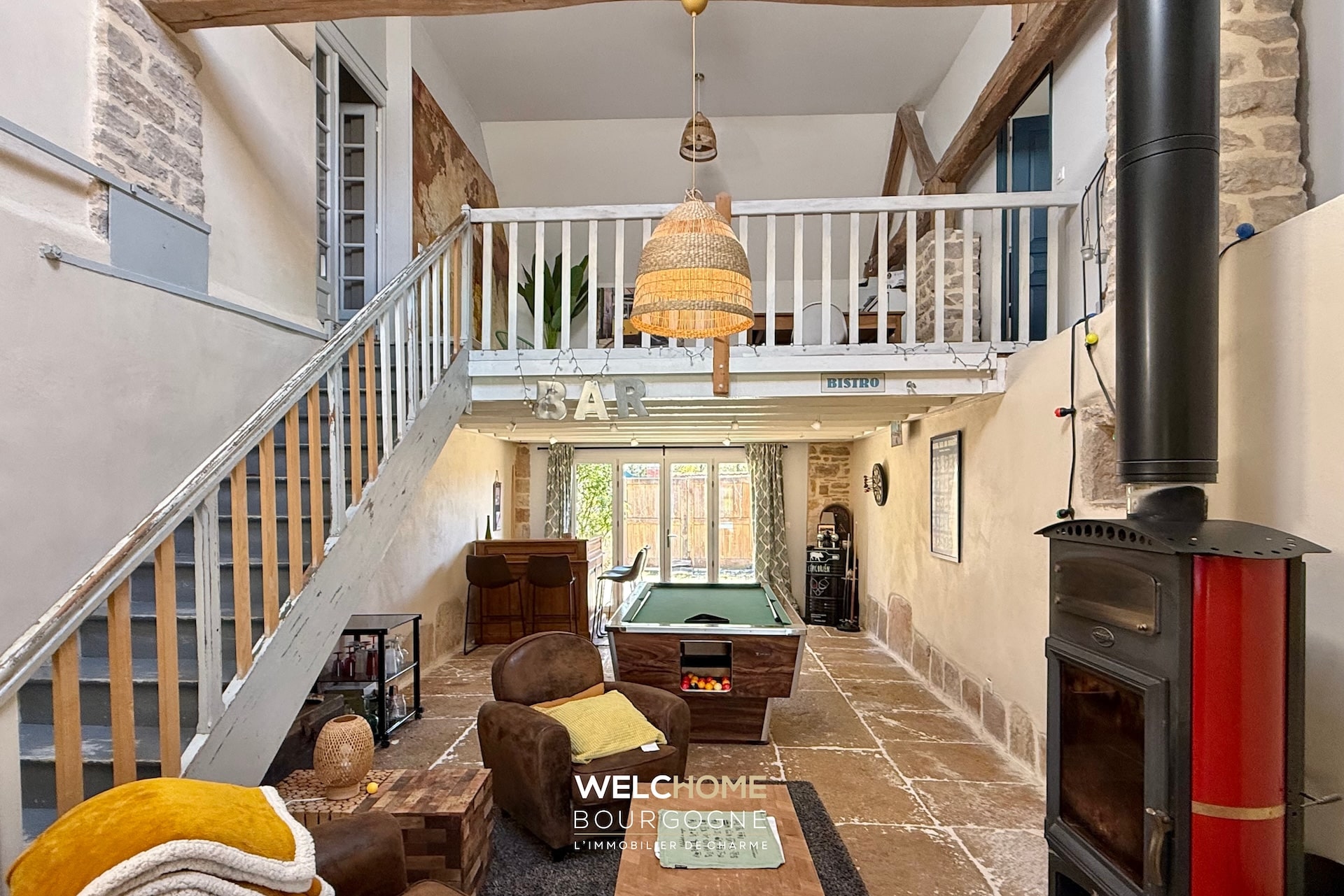 – Un salon cathédrale agrémenté d’un poêle à bois.