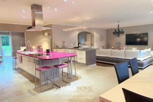 Au cœur d’un terrain paysagé et parfaitement à l’abri des regards, la villa développe 261 m² de plain-pied, baignés de lumière grâce aux larges baies aluminium à galandage. Les intérieurs révèlent des matériaux haut de gamme et des finitions d’une grande exigence : parquets massifs, jambages en pierre de taille, sols en pierre naturelle, plans en quartz, chauffage au sol et climatisation dans la suite parentale.