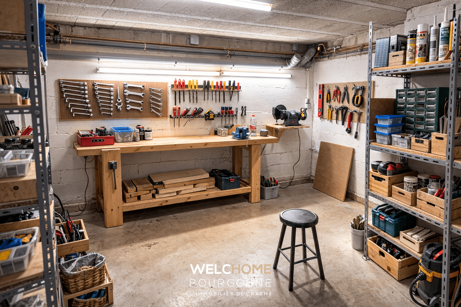 Élevée sur sous-sol aménagé en atelier, cave, et vaste espace de stockage, la maison offre des volumes complémentaires particulièrement fonctionnels.